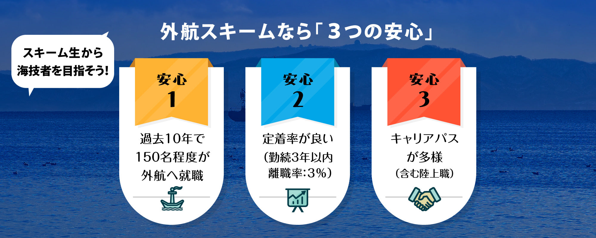 SECOJは外航商船での実務経験などを通じて、即戦力として活躍できる海技者(船員・SI等)としてのキャリア形成を図ることを目的として、外航日本人船員(海技者)確保・育成スキームを実施しています。